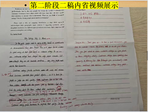 同伴互评阶段成为比赛的“成长加速器”。同学们匿名交换初稿,依据结构化的互评清单提出具体、可操作的修改建议,避免笼统评价。收到反馈后,还需对同伴意见的“清晰性、正确性、帮助性”进行回评打分,形成“互评-回评”的双向互动机制。在此基础上,同学们融合合理意见完成二稿,并以下划线标注修改处,同时录制不少于2分钟的视频说明“意见采纳/拒绝理由”与“新增内容由来”,清晰呈现修改逻辑。此阶段中,多数同学的二稿在内容充实度与逻辑连贯性上均有显著提升。