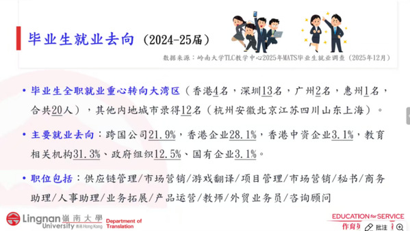 谈及毕业生发展前景,许定欣教授表示,项目毕业生就业路径多元,除传统翻译岗位外,还可进入教育、法律、商业及行政管理等领域的大湾区企业。此外,学校与墨尔本大学设有双硕士学位合作项目,成绩优异者完成首年学习后可申请攻读第二学位。在学业支持方面,学校提供专业资格认证辅导,并安排教授与学生一对一指导,学生可结合个人规划选择撰写学术论文或完成长篇翻译作品。