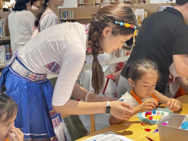 75日,白云图书馆与我校教育学院联合举办的“非遗·鄂温克族”绘本讲读与太阳花制作公益活动,于白云图书馆负一楼少儿阅览区圆满落幕。此次活动由我院23级学前教育专业赵欣菲同学担任主讲老师,她用生动的语言和多样的互动方式,引领小朋友们探索鄂温克族非遗文化的独特魅力。同时,23级小学教育4班的韩洁思同学担任助教。