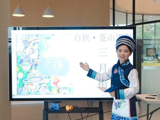 活动伊始,主讲教师陈宝怡同学身着白族服饰惊艳亮相,瞬间吸引了孩子们的目光。当孩子们好奇于老师的独特服饰时,陈宝怡以生动形象的语言,引领孩子们走进云南大理白族人的神话故事世界。在她的讲述下,孩子们仿若置身大理的苍山洱海间,感受白族人民的智慧与情感,领略民族文化之美。孩子们在她的带领下,学习了用白族话进行简单交流,一句句稚嫩的“脑秋”(你好)回荡在活动现场,传递着孩子们对白族文化的喜爱与尊重。